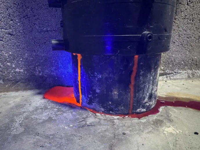 Lorsque ce liquide s’échappe, il colore immédiatement la zone d’infiltration ou brille sous lumière UV.